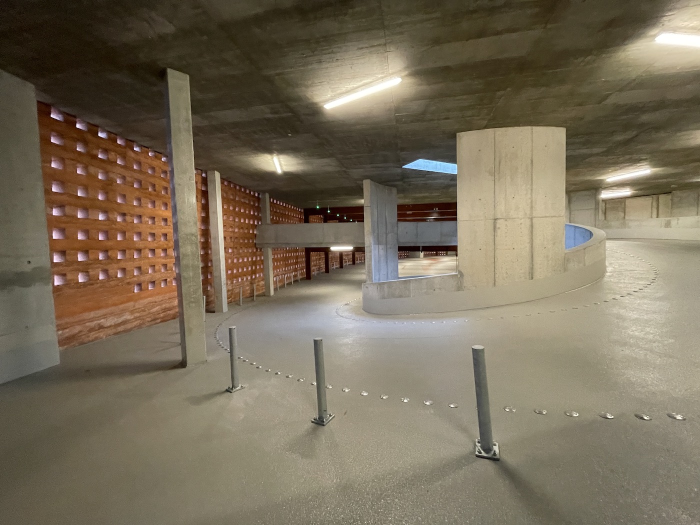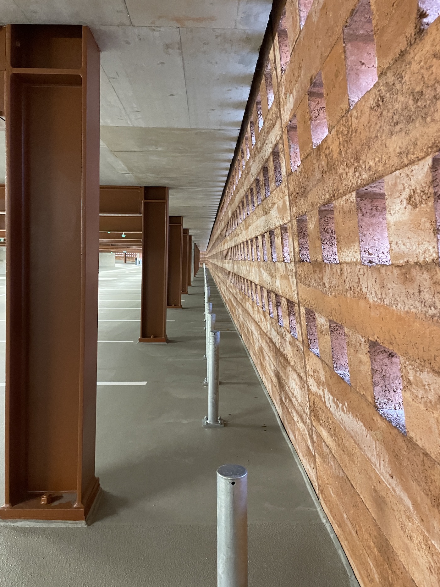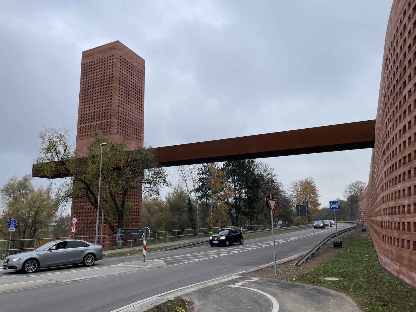 Eine Brücke aus Cortenstahl führt über die Umgehungsstraße zu einem markanten Aussichtsturm und verbindet über eine spiralförmige, derzeit zurückgestellte Fahrradrampe Stadt und Rheinaue. Hier vereinen sich komplexe Aufgabenstellungen im Tiefbau mit der Wiederbelebung historischer Bautechniken. Mit der perforierten Parkhauswand aus Stampfbeton wird der „Stadtrand“ überraschend poetisch manifestiert!