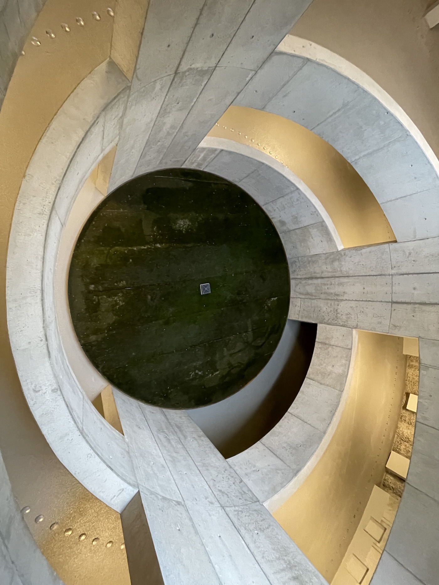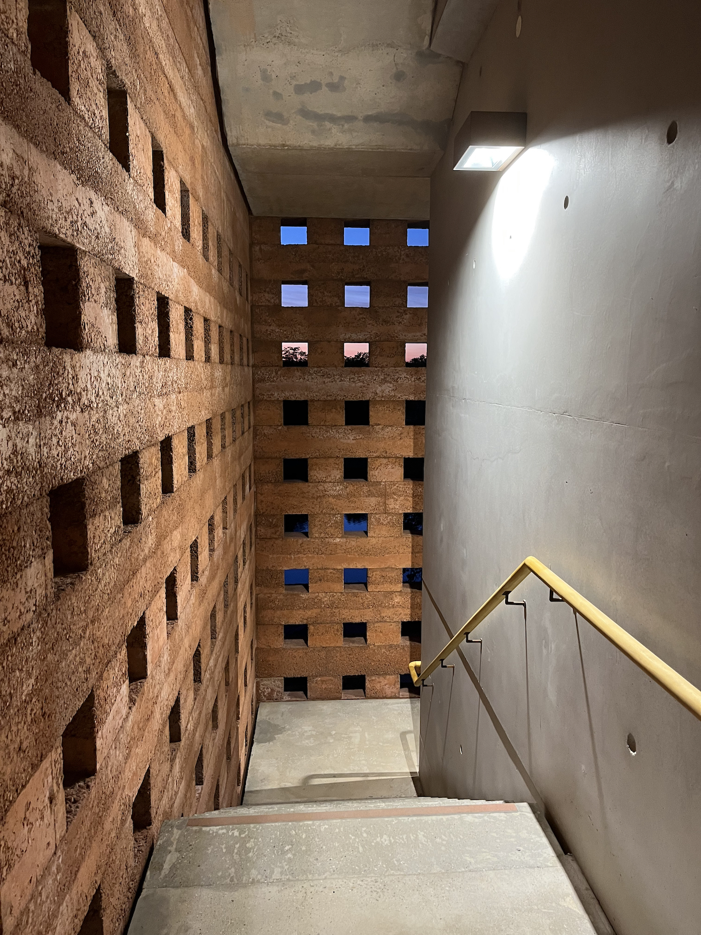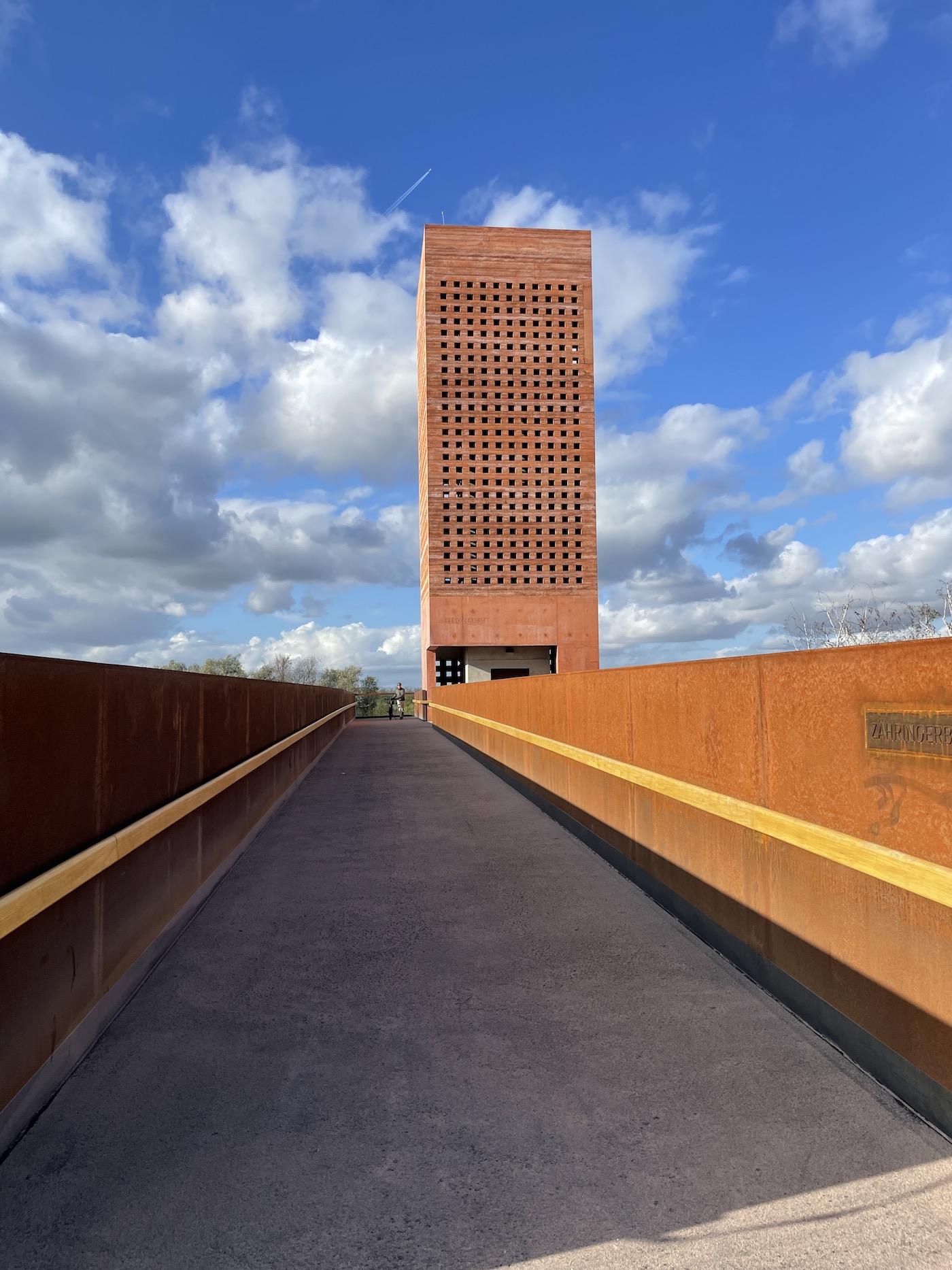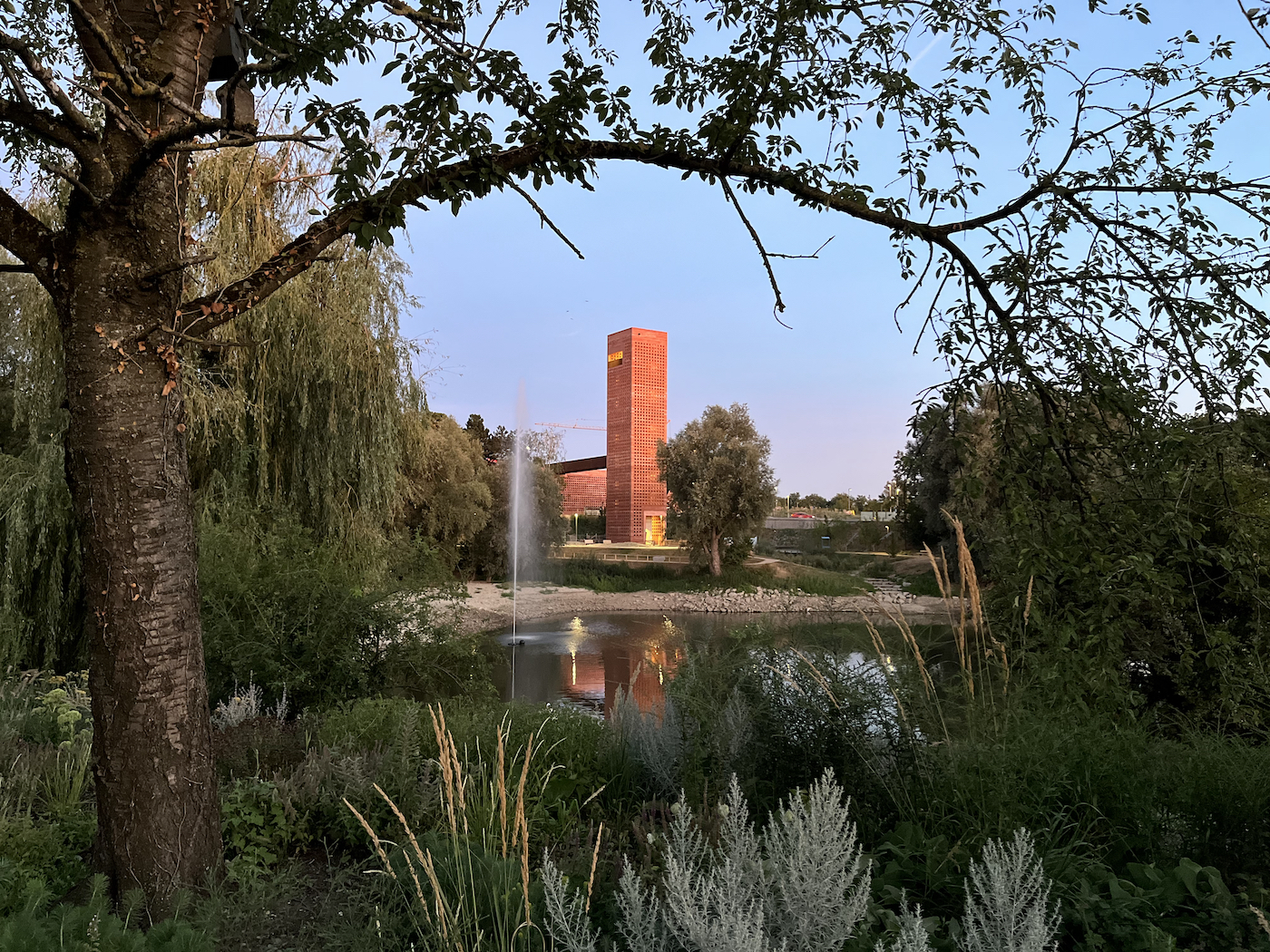 Eine Brücke aus Cortenstahl führt über die Umgehungsstraße zu einem markanten Aussichtsturm und verbindet über eine spiralförmige, derzeit zurückgestellte Fahrradrampe Stadt und Rheinaue. Hier vereinen sich komplexe Aufgabenstellungen im Tiefbau mit der Wiederbelebung historischer Bautechniken. Mit der perforierten Parkhauswand aus Stampfbeton wird der „Stadtrand“ überraschend poetisch manifestiert!