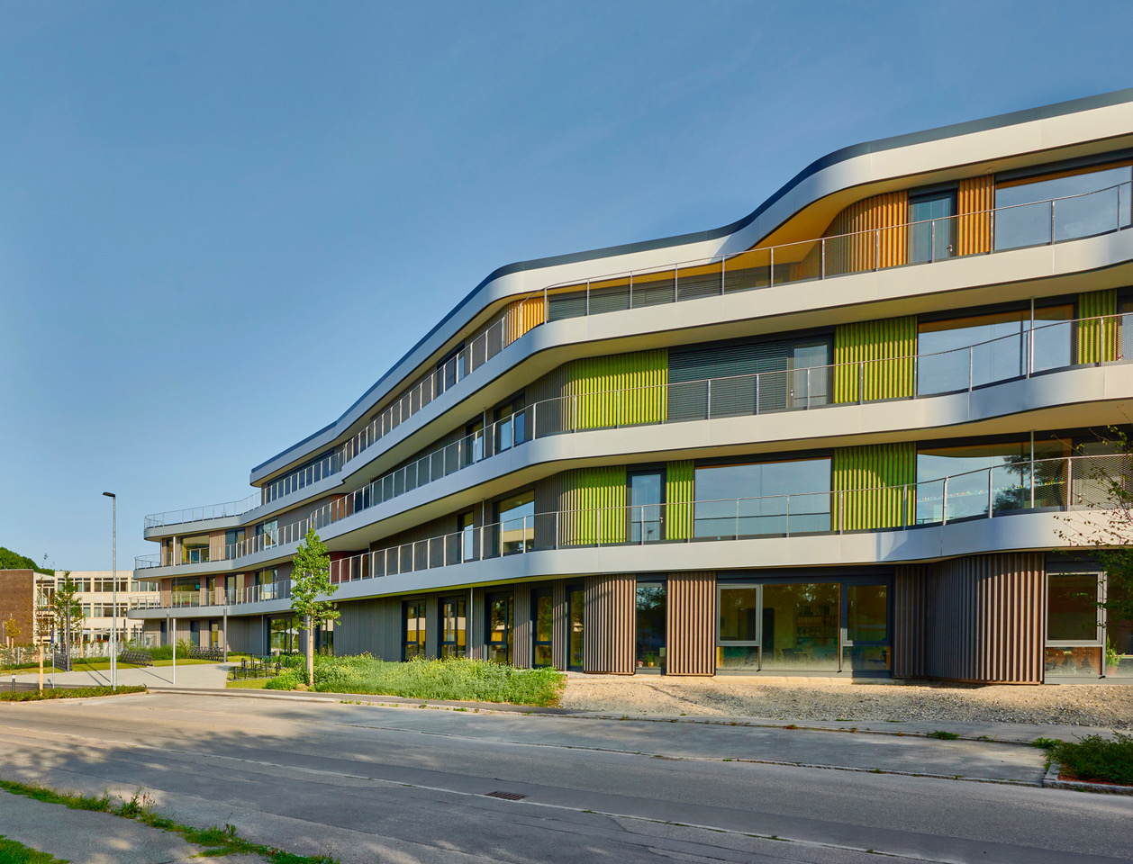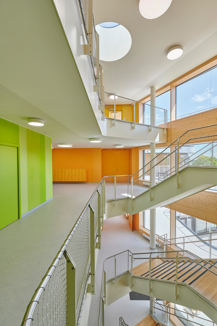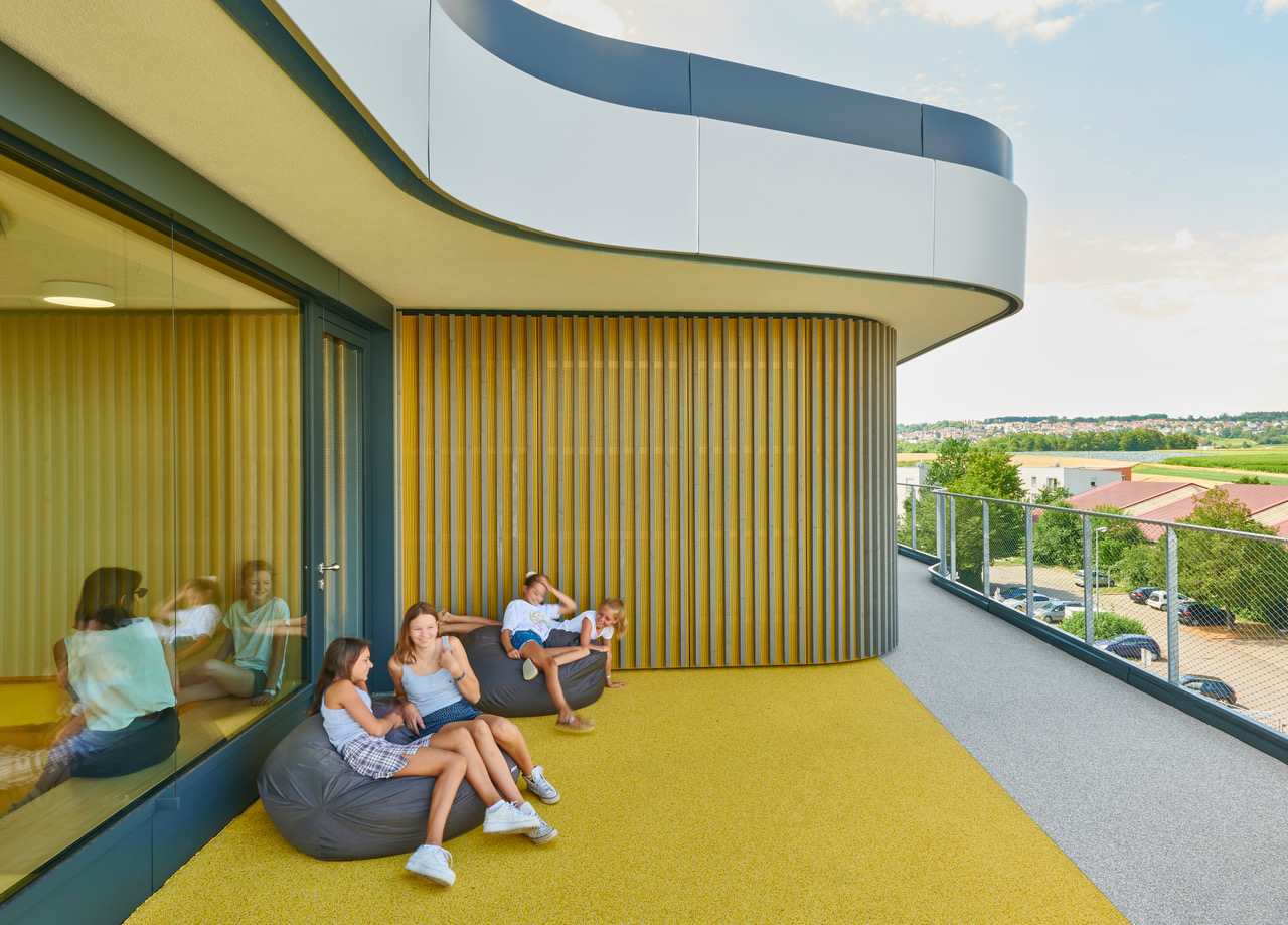 Frei gestaltete Lernebenen mit umlaufenden Balkonen prägen das äußere Erscheinungsbild. Nach verlängerter Bauzeit stehen zum Schuljahresbeginn 2020 die Baulichkeiten für ein neues pädagogisches Konzept zur Verfügung.