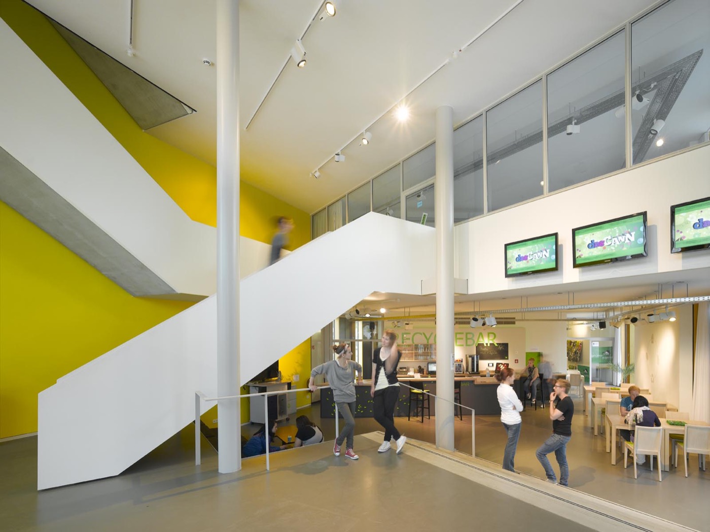 Ein horizontal und vertikal umlaufendes Sichtbetonband hält die unterschiedlichen Raum- und Funktionsbereiche in einer komplexen Geometrie zusammen. Thermoaktive Sichtbetondecken für Heizung und Kühlung und die kombinierte Nutzung von Fernwärme und Solarenergie versprechen einen sehr niedrigen Primärenergieverbrauch.