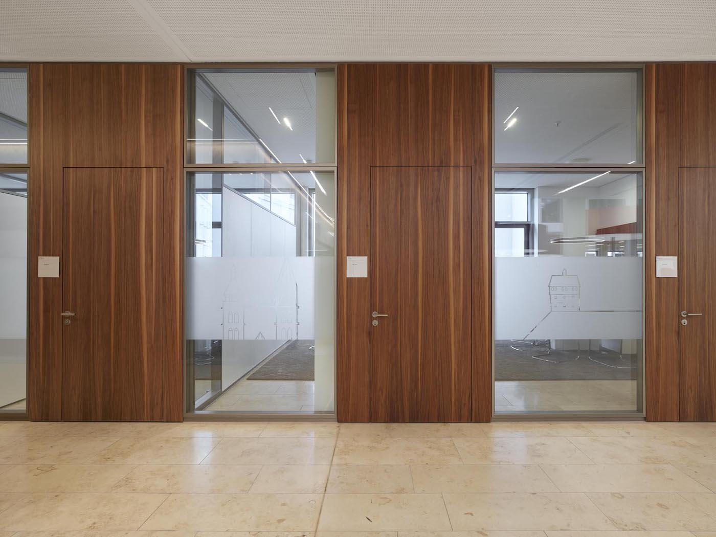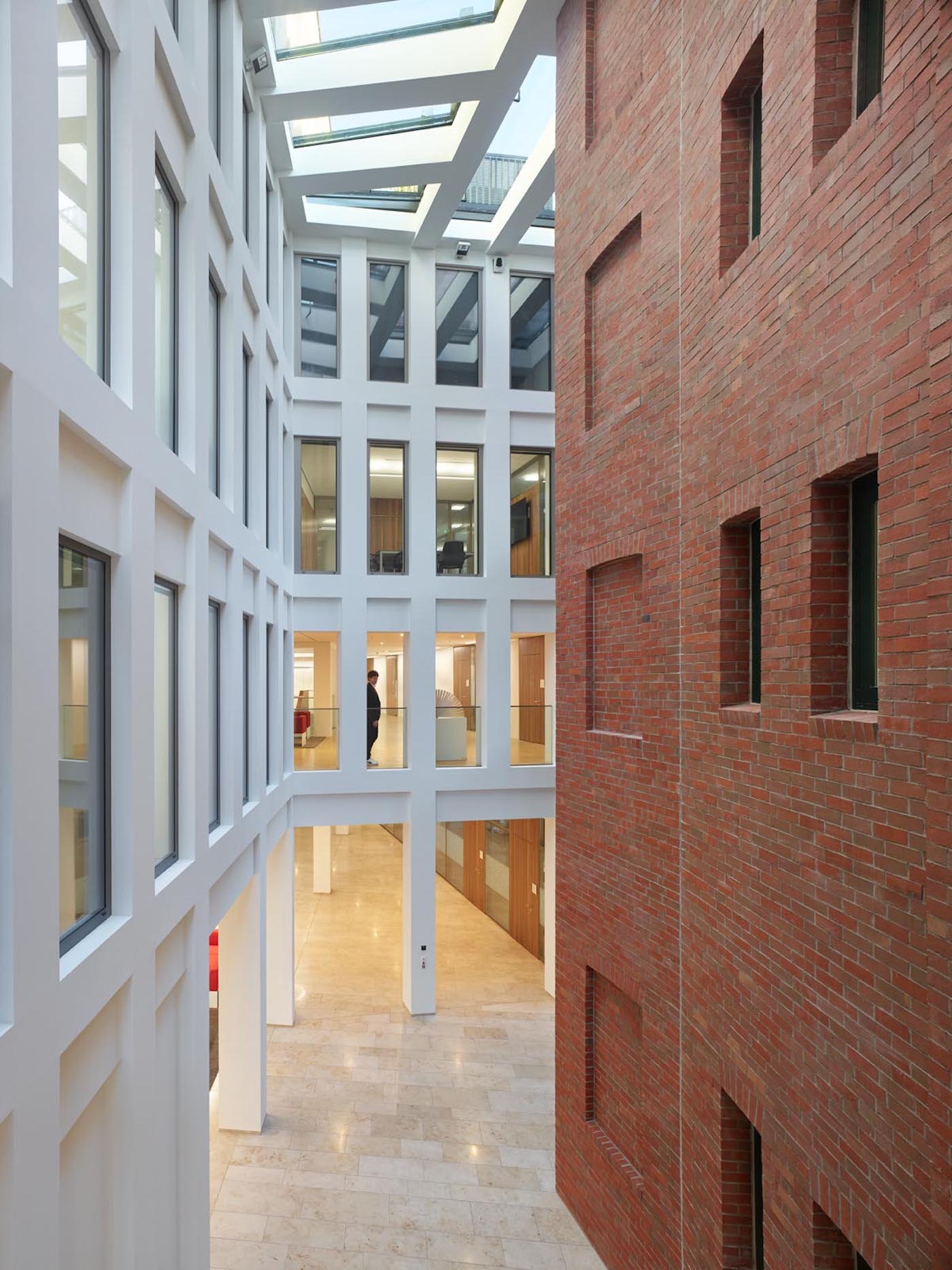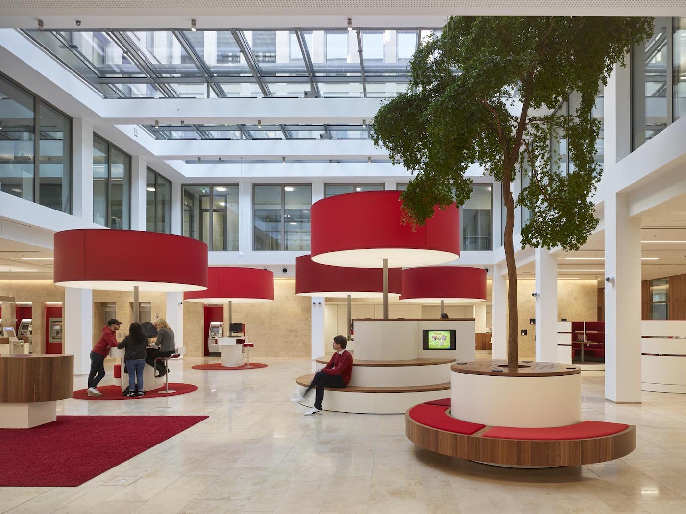 Die glasüberdeckte Kunsthalle im Innenhof des Gevierts ist Herzstück der Hauptstelle. Ein schmuckes Fachwerkhaus, der »Falken« aus dem 19. Jahrhundert, wurde im Vorgriff als wertgeschätzter Eckstein des Quartiers saniert und ist nun intern über gebäudehohe Lufträume mit dem Ensemble verbunden.