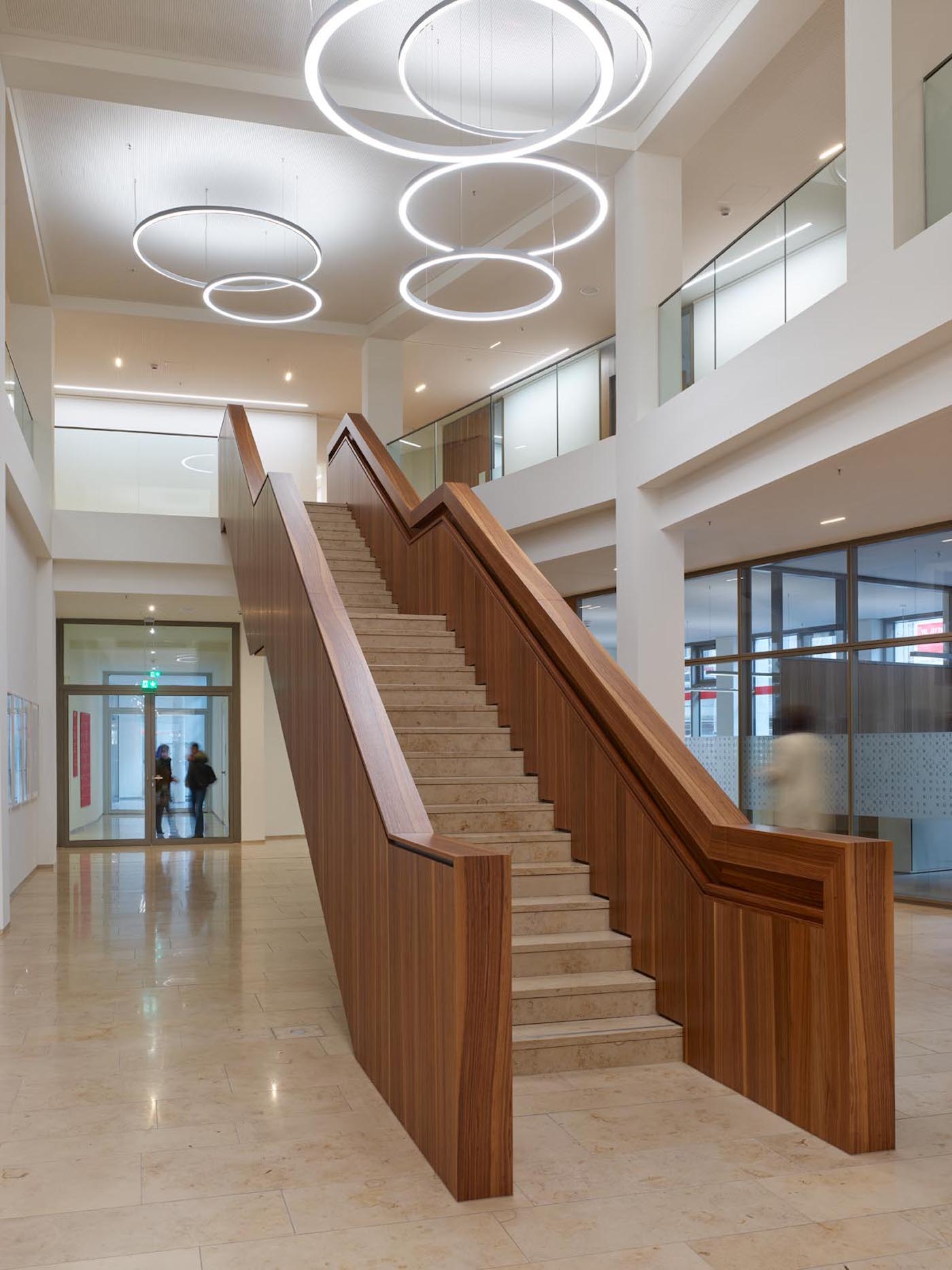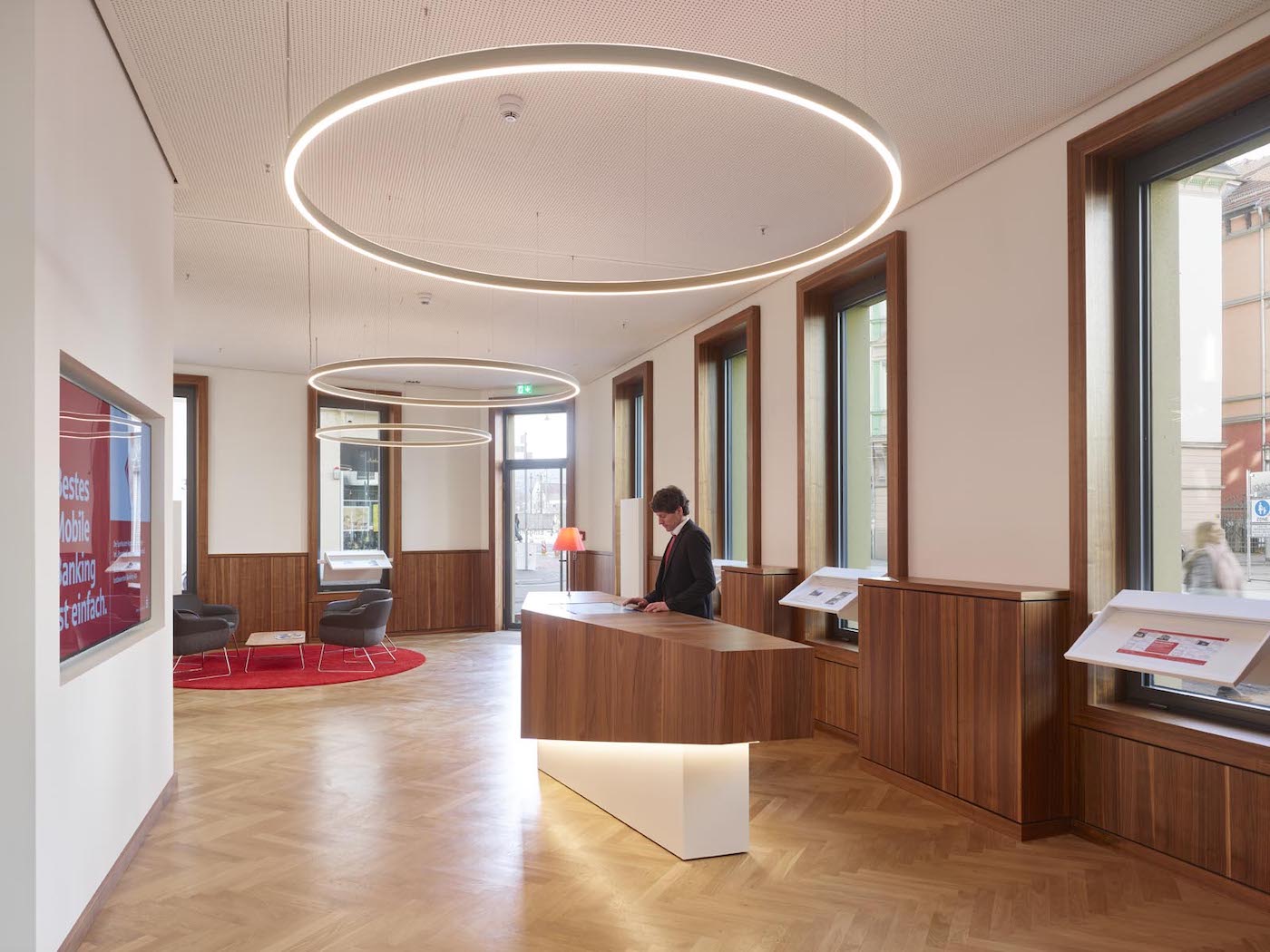 Die aus heterogenen Bausteinen bestehende Hauptstelle in Esslingen bedurfte einer grundlegenden Neuorganisation des Bestands. Neben der innenräumlichen Neugestaltung der Gebäude  aus den 90er Jahren bildet nun ein markant geschwungener Neubau die Adresse an der Bahnhofstraße.