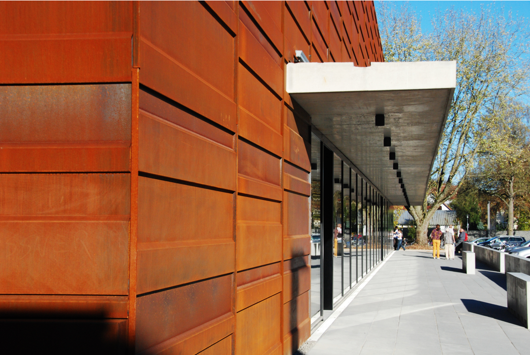 Das kompakte Volumen, das allseits mit speziell gekanteten Cortenstahlblechen bekleidet wird, beinhaltet ferner ein separat für Feste nutzbares Foyer mit Küche und einen Gymnastiksaal.