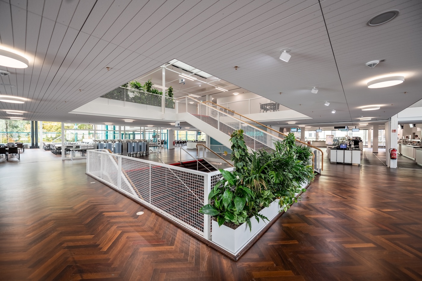 Das 1966 fertiggestellte, nun denkmalgeschützte Mensagebäude, von Paul Baumgarten entworfen, kann mit seinem Funktionsbau nicht mehr den heutigen Anforderungen genügen. Daher wird dieser abgebrochen, in etwas vergrößerter Form durch einen geklinkerten Kubus ersetzt, aber die luftigen Speisesäle und der über Steg verbundene Verwaltungskubus nach Schadstoffsanierung weitgehend originalgetreu Instand gesetzt.