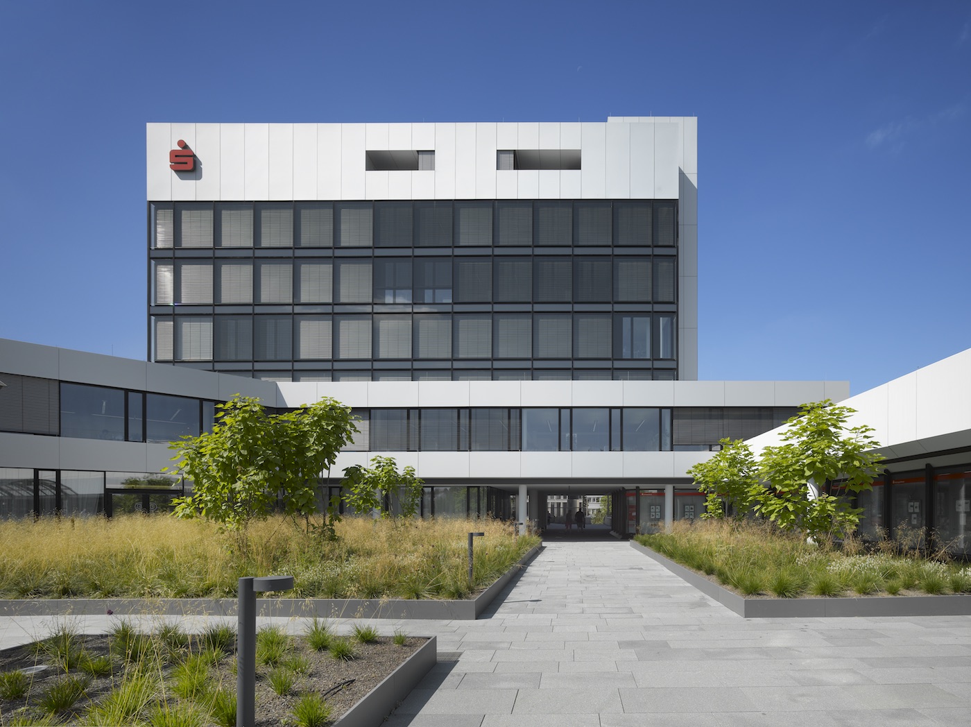 Die Neustrukturierung der bestehenden Sparkassenzentrale umfasst den Neubau-„Riegel“ mit neuer Kundenhalle an der Bahnhofstraße sowie die Generalsanierung von Bauabschnitten der 70er Jahre. In die vormalige Kundenhalle wird ein polygonaler, separat nutzbarer Veranstaltungssaal für 400 Personen mit Hubbühne implantiert.